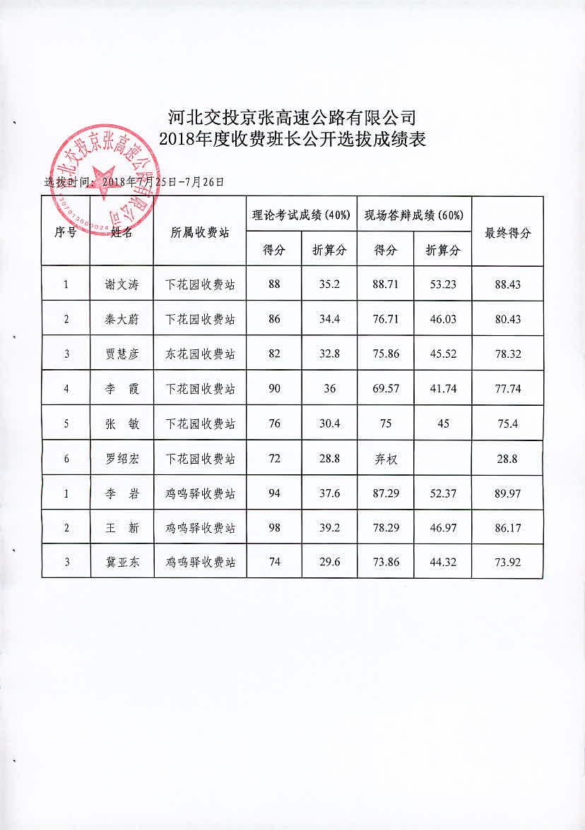 公司2018年收費(fèi)班長公開選拔成績公示
