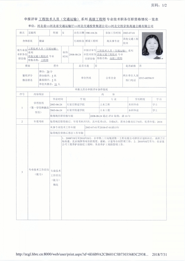 京張公司2018年度專業(yè)技術(shù)職稱申報(bào)公示(吳銀利)