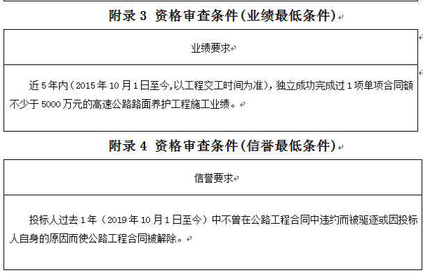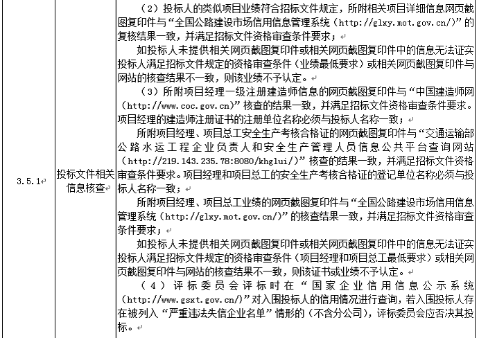 投標(biāo)人應(yīng)進(jìn)入交通運(yùn)輸部“全國公路建設(shè)市場信用信息管理系統(tǒng)(http://glxy.mot.gov.cn)”中的公路工程施工資質(zhì)企業(yè)名錄,且投標(biāo)人名稱和資質(zhì)與該名錄中的相應(yīng)企業(yè)名稱和資質(zhì)完全一致。